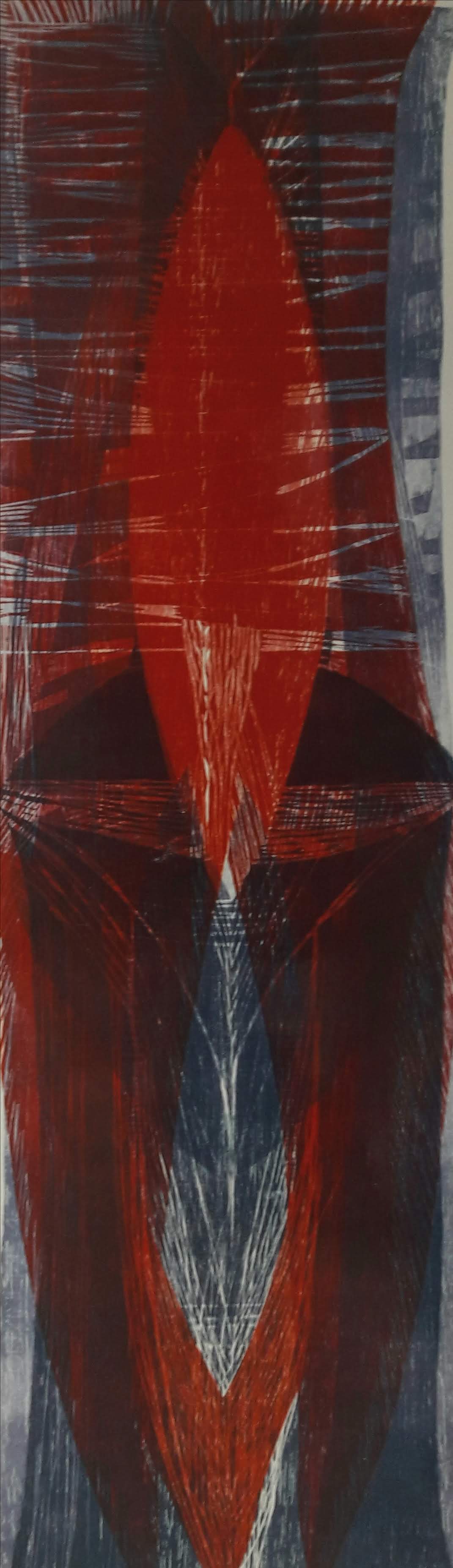 4. Verticalização – a vertical já se insinuava entre as curvas e extensões dos vermelhos das imagens anteriores. A partir destas gravuras, a vertical também se afirma espacialmente e, agora ocorre a inversão: são as curvas que se insinuam entre as verticais. Também as matrizes possuem um formato maior, já não uso tantas matrizes-fragmentos. A imagem de Verticalização III, causou-me o mesmo impacto que a oval vazia de Pulsações I. Aqui não é um vazio, mas um cheio, resultando da justaposição e sobreposição das cores. É um vermelho incisivo, onde uma flecha aponta ora para cima, ora para baixo.