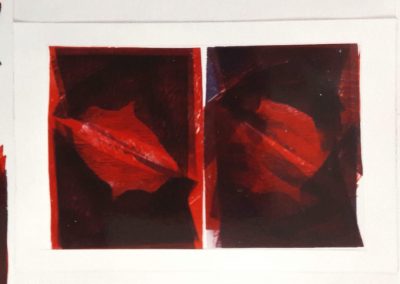 Na série Opsições Polares, investigo um processo mais “direto”. Abandono o rigor dos registros precisos para trabalhar com as permutações das matrizes moduladas, impressas em sobreposições de cores. Estabeleço limites de cores, (1 vermelho quente, 1 vermelho frio e 1 roxo) mas utilizo um número ilimitado de matrizes para construir uma imagem. Em trabalhos anteriores, a matriz tinha a função de reproduzir a imagem repetidas vezes. Busco a duplicidade da matriz e não a sua multiplicidade. Contudo, a técnica não é improvisação, mas pesquisa plástica.  O gravar não é mera incisão na madeira e preparação da matriz, da mesma forma que o imprimir não é uma estampagem mecânica.  As matrizes moduladas não são submetidas a racionalidade de um desenho, são mais intuitivas. São construídas a partir de inquietações relacionadas com as oposições polares internas associadas ao meu universo imaginário.